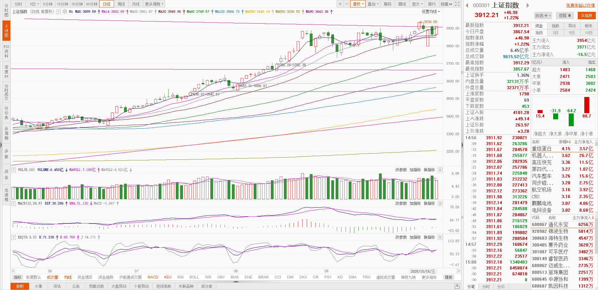 10月15日电,A股三大指数今日午后探底回升,沪指收复3900点整数关口。截止收盘,沪指涨1.22%,收报3912.21点;深证成指涨1.73%,收报13118.75点;创业板指涨2.36%,收报3025.87点。沪深两市成交额达到20729亿,较昨日大幅缩量5034亿。