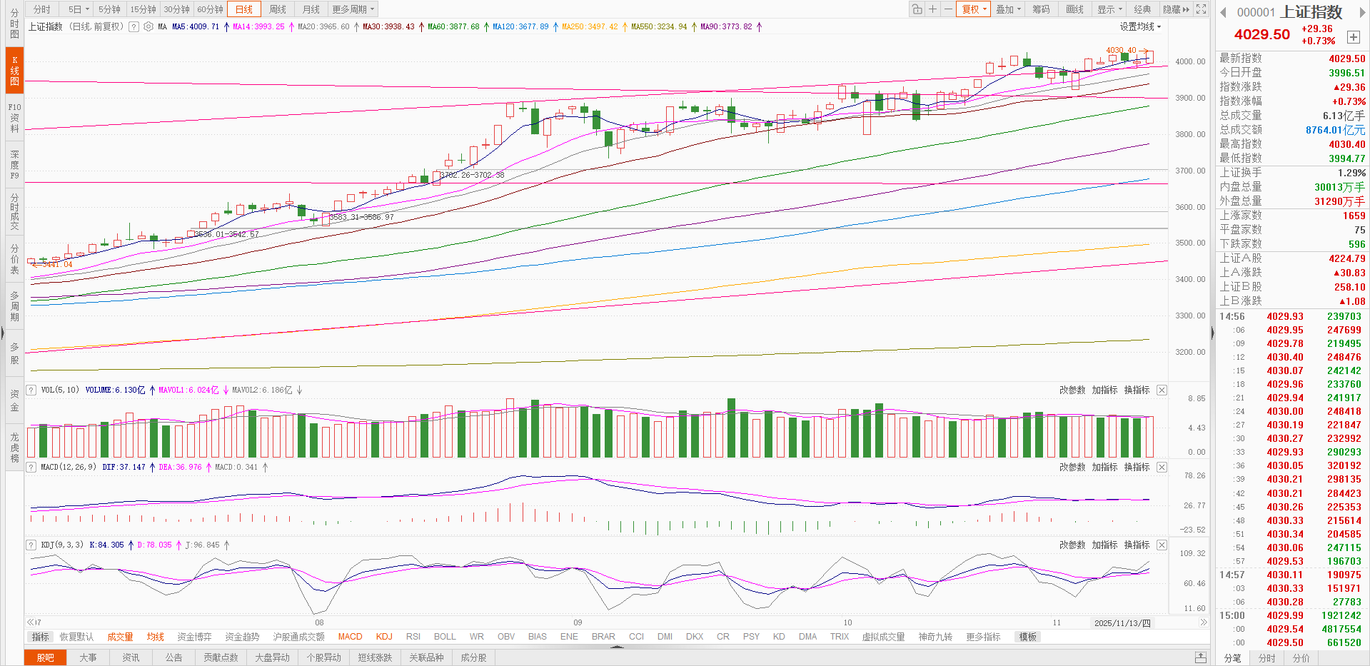 A股三大指数今日集体走强,沪指再度刷新十年新高。截止收盘,沪指涨0.73%,收报4029.50点;深证成指涨1.78%,收报13476.52点;创业板指涨2.55%,收报3201.75点。沪深两市成交额达到20420亿,较昨日放量969亿。