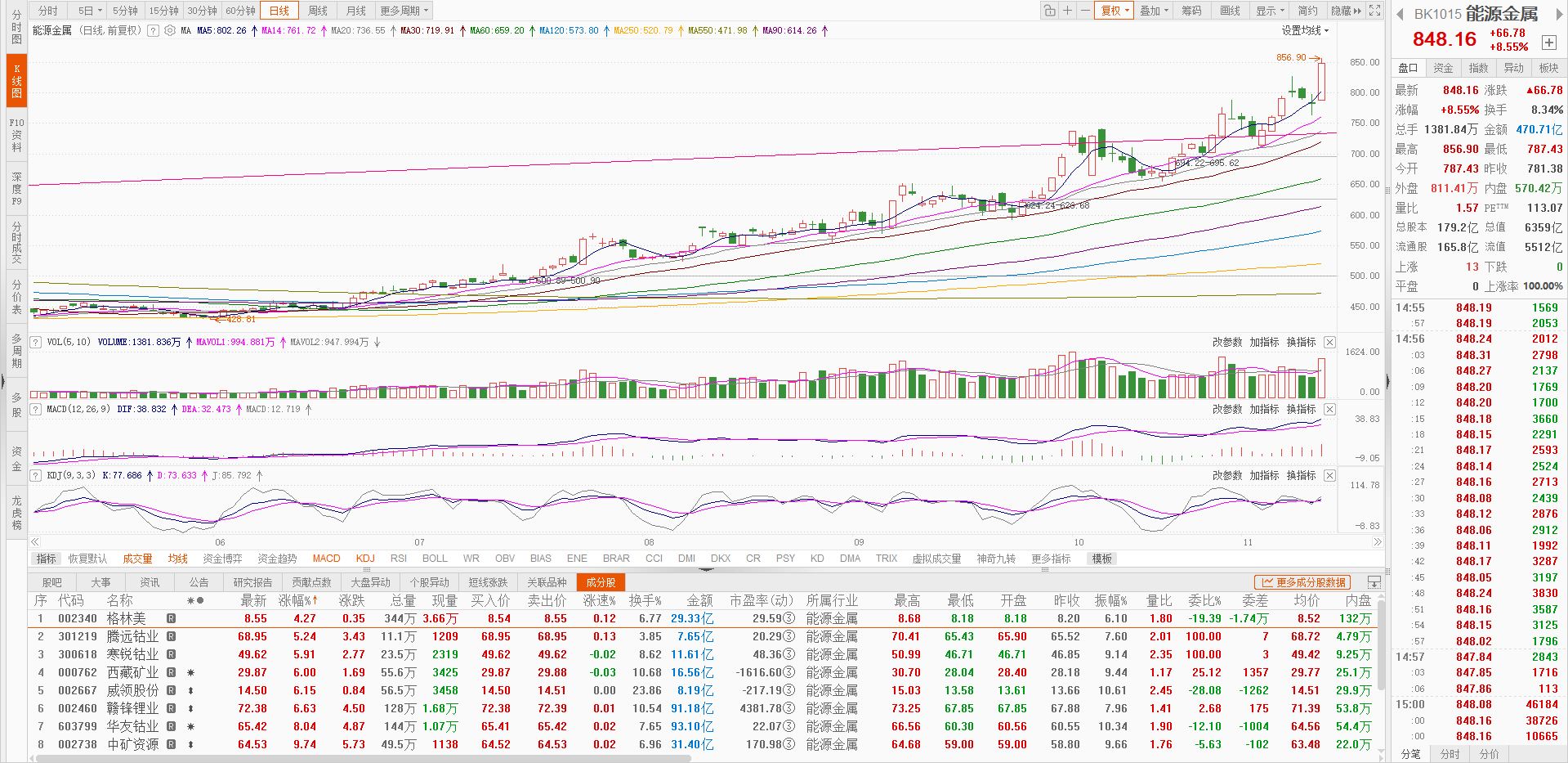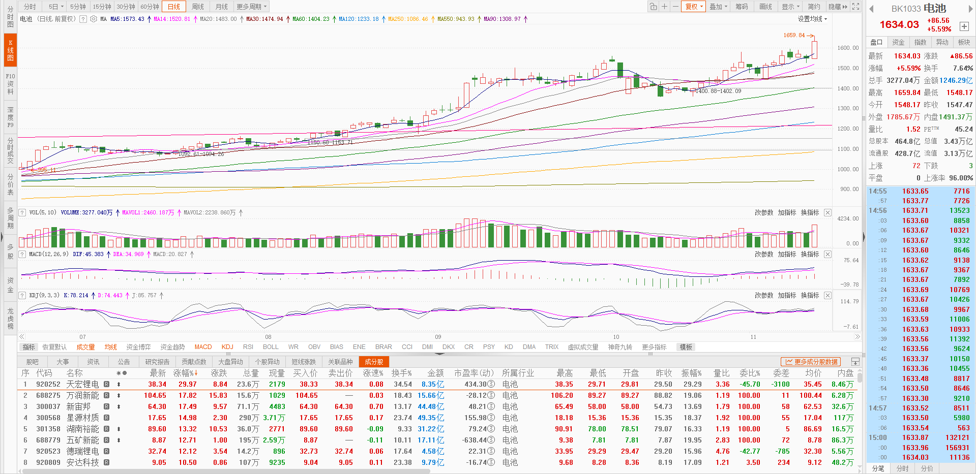行业板块几乎全线上扬,能源金属、电池、化肥行业、贵金属、电源设备、非金属材料、有色金属、化学原料、化学制品、小金属板块涨幅居前,仅铁路公路、银行、电力行业逆市翻绿。