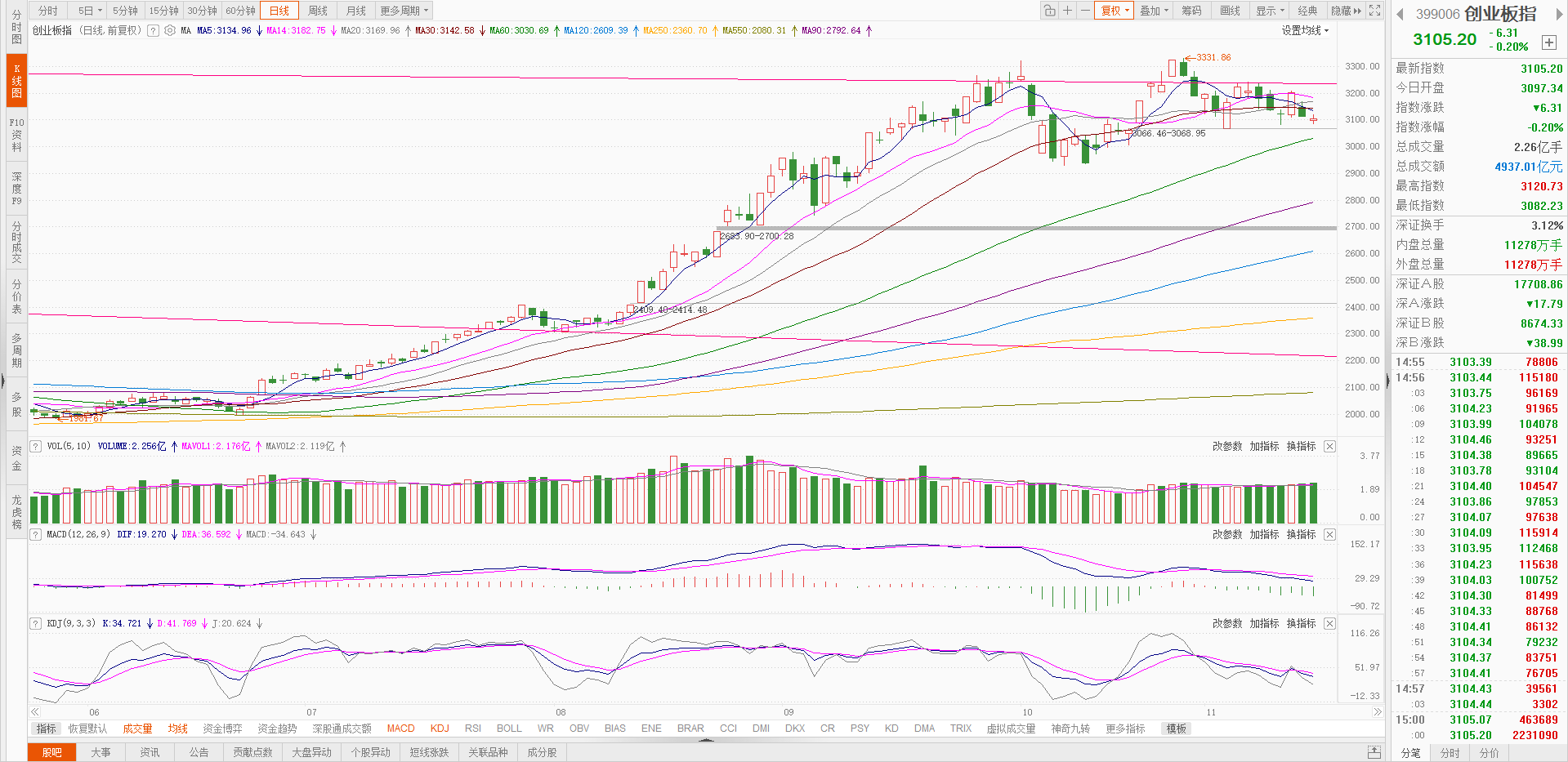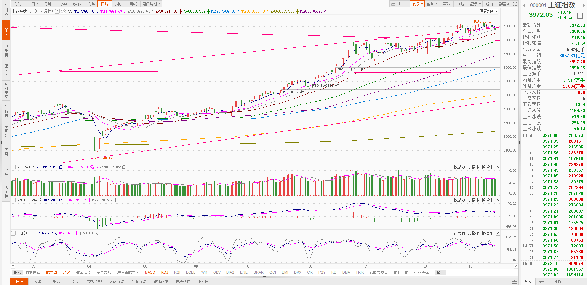 11月17日电,A股三大指数今日集体回调,截止收盘,沪指跌0.46%,收报3972.03点;深证成指跌0.11%,收报13202.00点;创业板指跌0.20%,收报3105.20点。沪深两市成交额19108亿,较上一交易日缩量473亿。