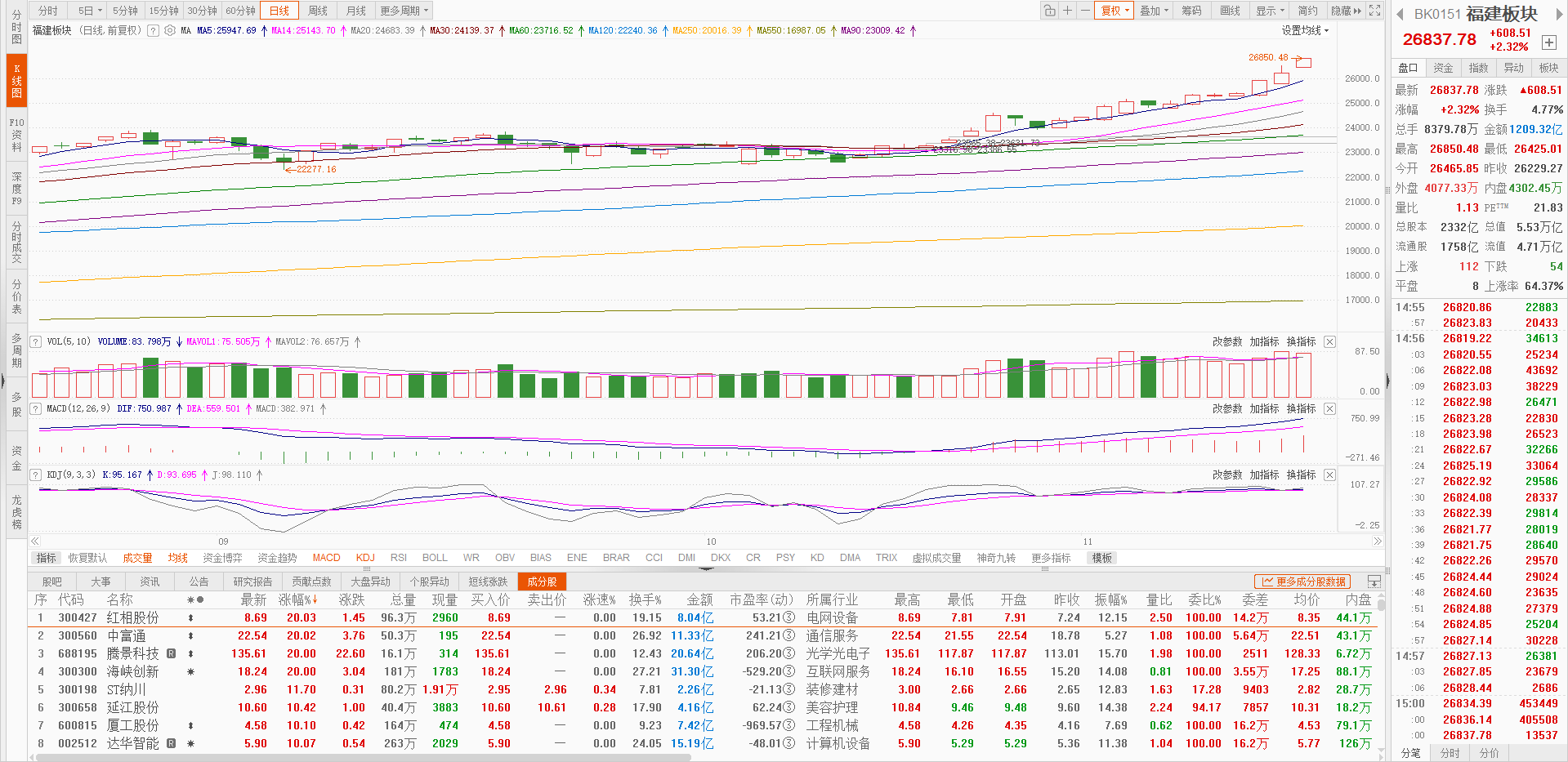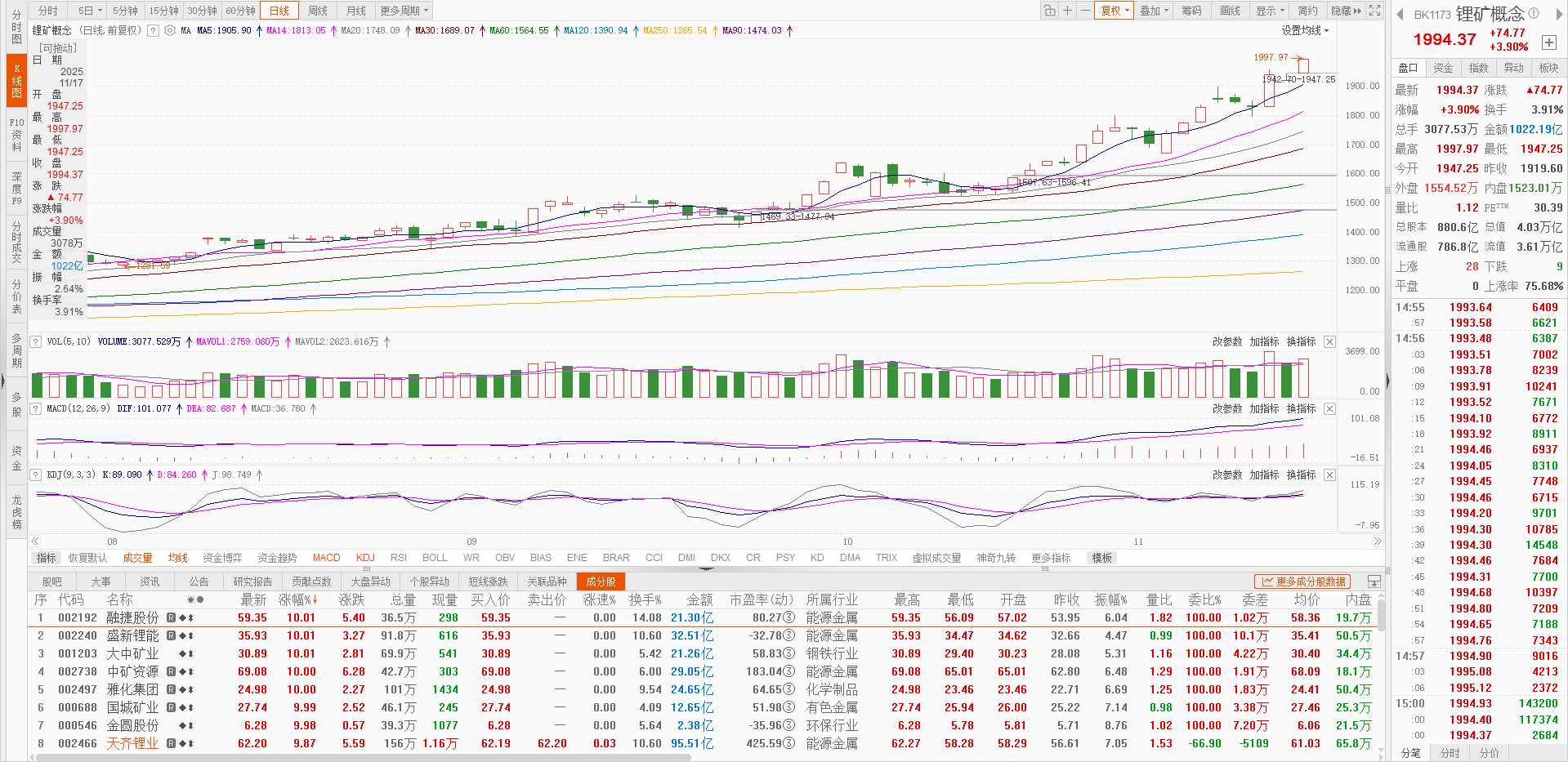 个股方面,上涨股票数量接近2600只,百股涨停。锂矿概念股爆发,盛新锂能、融捷股份、大中矿业、中矿资源、雅化集团、国城矿业、金圆股份等多只股票涨停。福建板块延续强势,厦工股份10天5板,平潭发展、龙洲股份3连板。AI应用概念快速走强,三六零、浪潮软件、宣亚国际等多股涨停。军工板块表现活跃,航天发展2连板。下跌方面,医药概念集体下挫,舒泰神、济民健康等大跌。