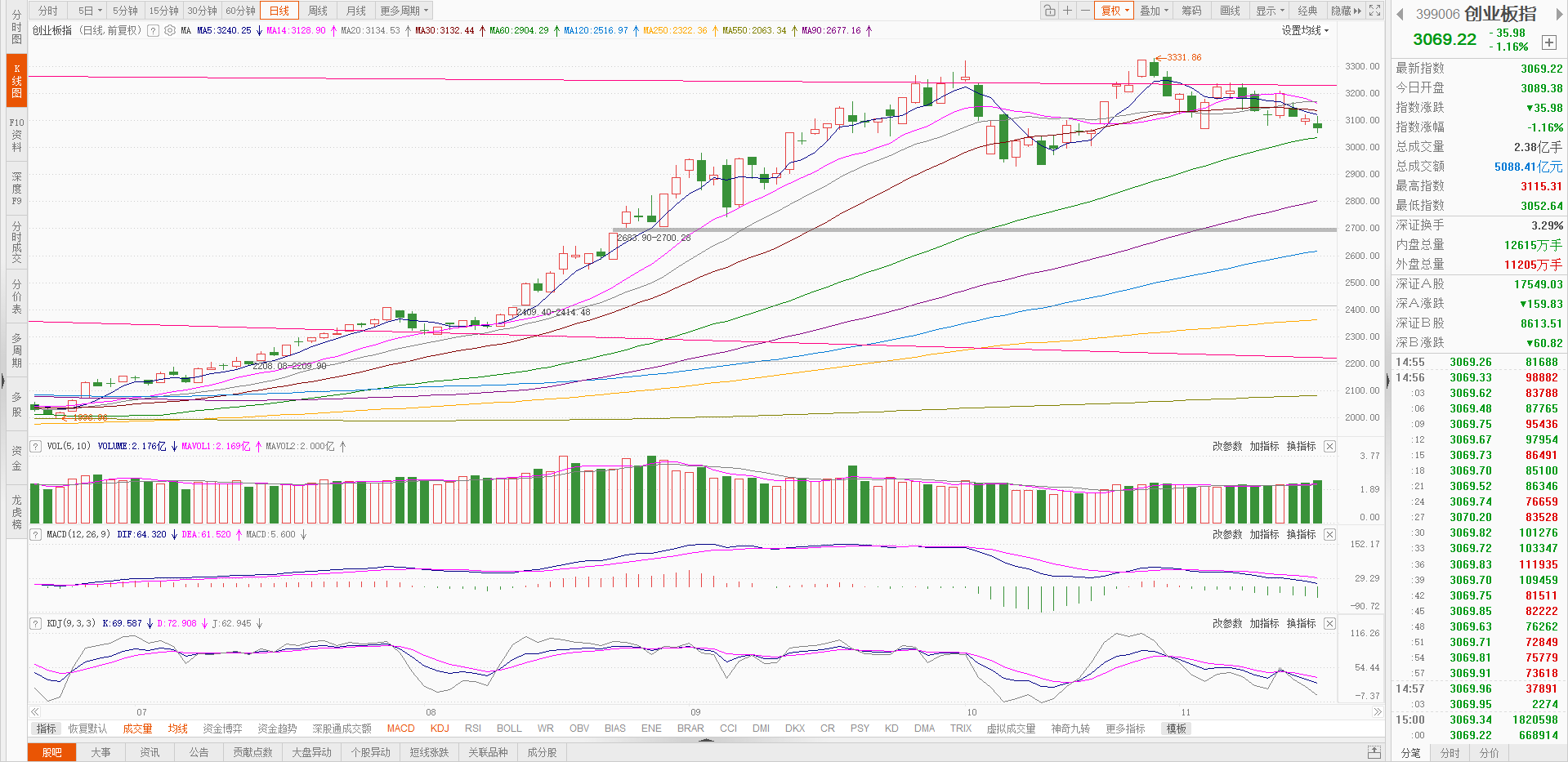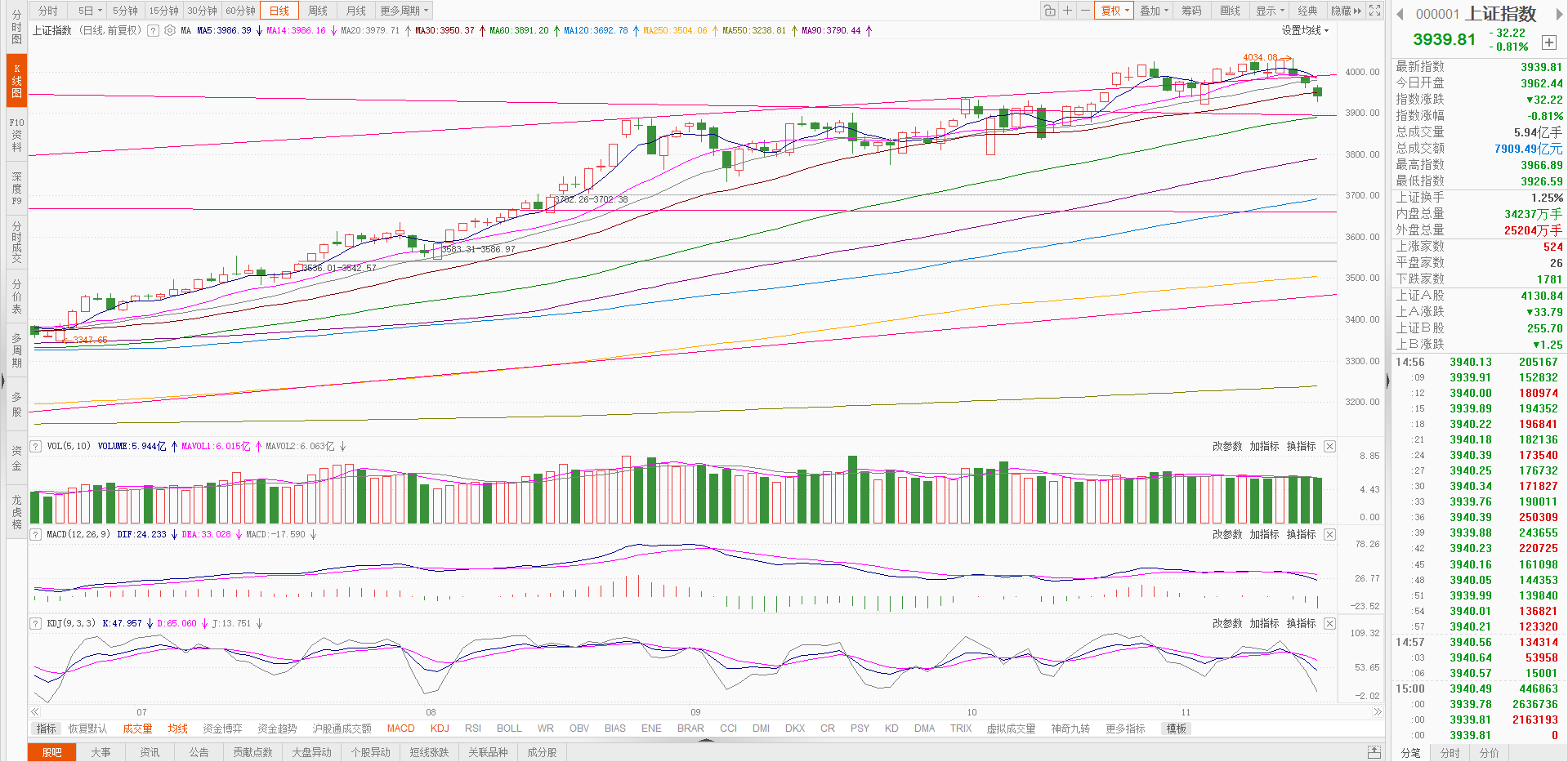 A股三大指数今日集体回调,沪指日K线三连阴。截止收盘,沪指跌0.81%,收报3939.81点;深证成指跌0.92%,收报13080.49点;创业板指跌1.16%,收报3069.22点。沪深两市成交额19261亿,较昨日小幅放量153亿。