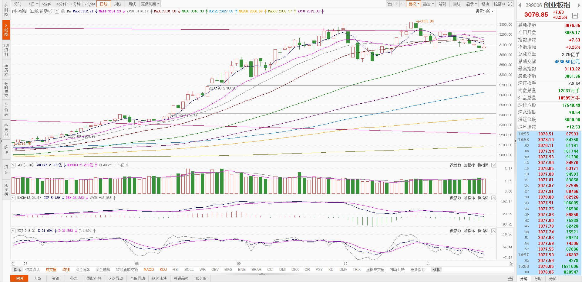 11月19日电,A股三大指数今日涨跌不一,沪指涨0.18%,深证成指涨0.0%,创业板指涨0.25%。沪深两市成交额超过1.7万亿,较昨日缩量约2000亿。