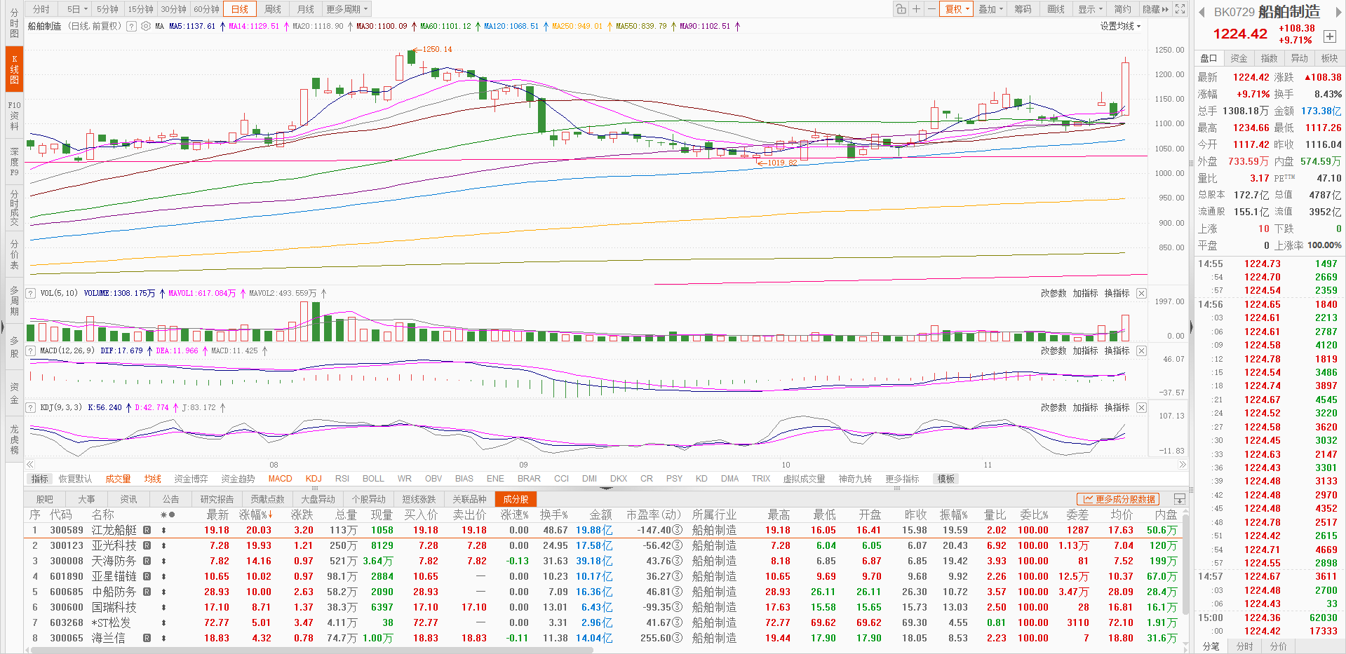 个股方面,上涨股票数量超过1200只,逾60只股票涨停。船舶制造板块爆发,江龙船艇、亚光科技20cm涨停,亚星锚链、中船防务涨停。水产养殖板块午后拉升,獐子岛、大湖股份、天马科技、百洋股份、开创国际、中水渔业、东方海洋、好当家涨停。