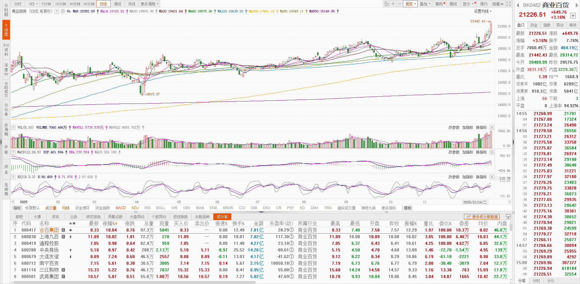 行业板块呈现普涨态势,房地产服务、商业百货、包装材料、食品饮料、纺织服装、家用轻工、汽车服务、房地产开发板块涨幅居前,贵金属、半导体板块跌幅居前。