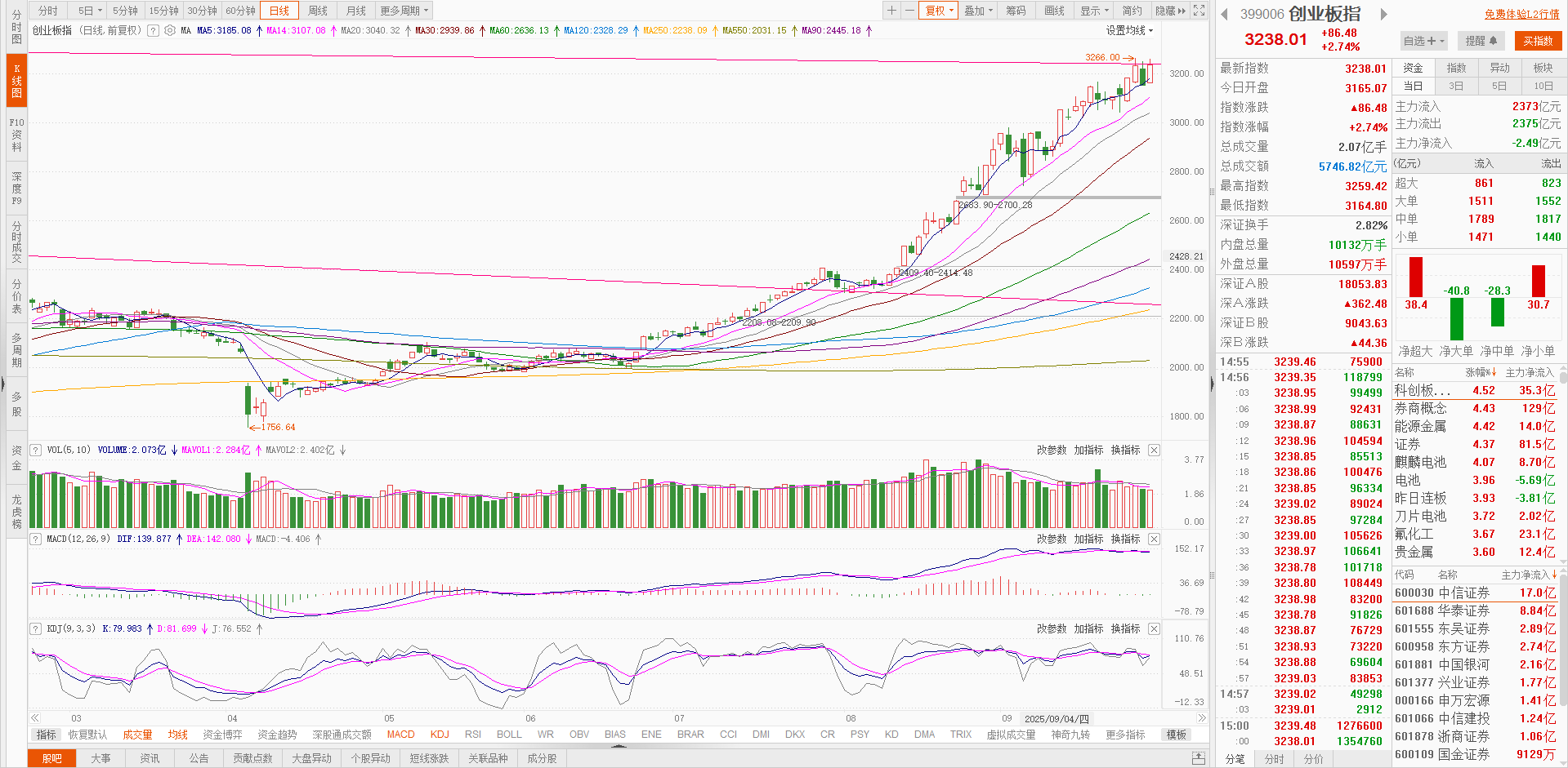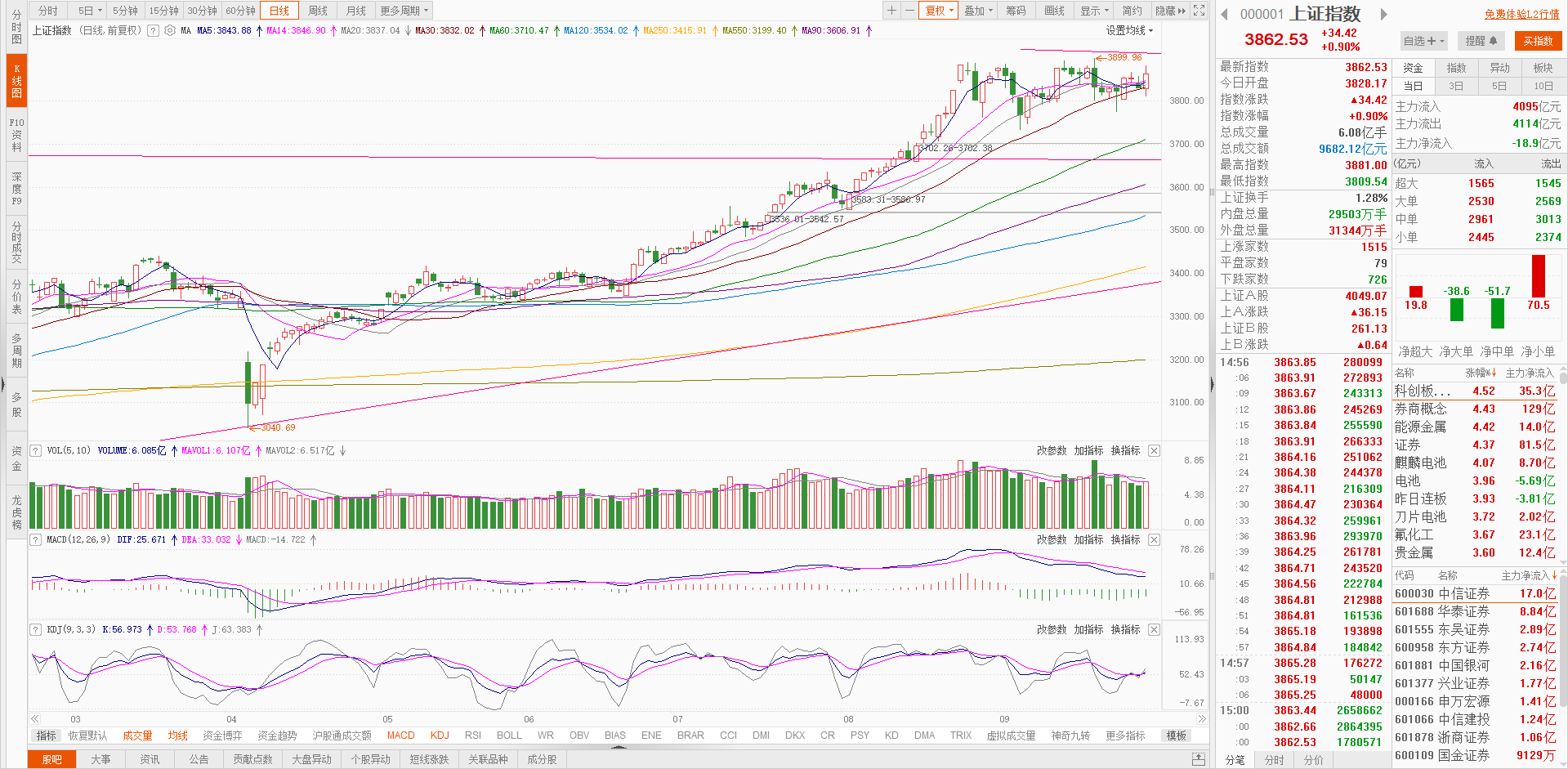 A股三大指数今日集体上涨,截止收盘,沪指涨0.90%,收报3862.53点;深证成指涨2.05%,收报 13479.43点;创业板指涨2.74%,收报3238.01点。沪深两市成交额达到21615亿,较上一交易日放量146亿。